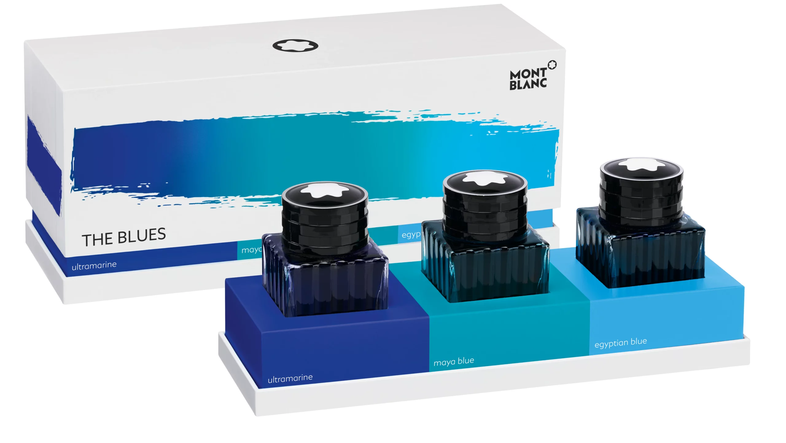 Montblanc enrichit son assortiment d’un nouveau format et propose un coffret de trois flacons d’encre de 30 ml de sa ligne Palette : Ultramarine, Maya Blue et Egyptian Blue.